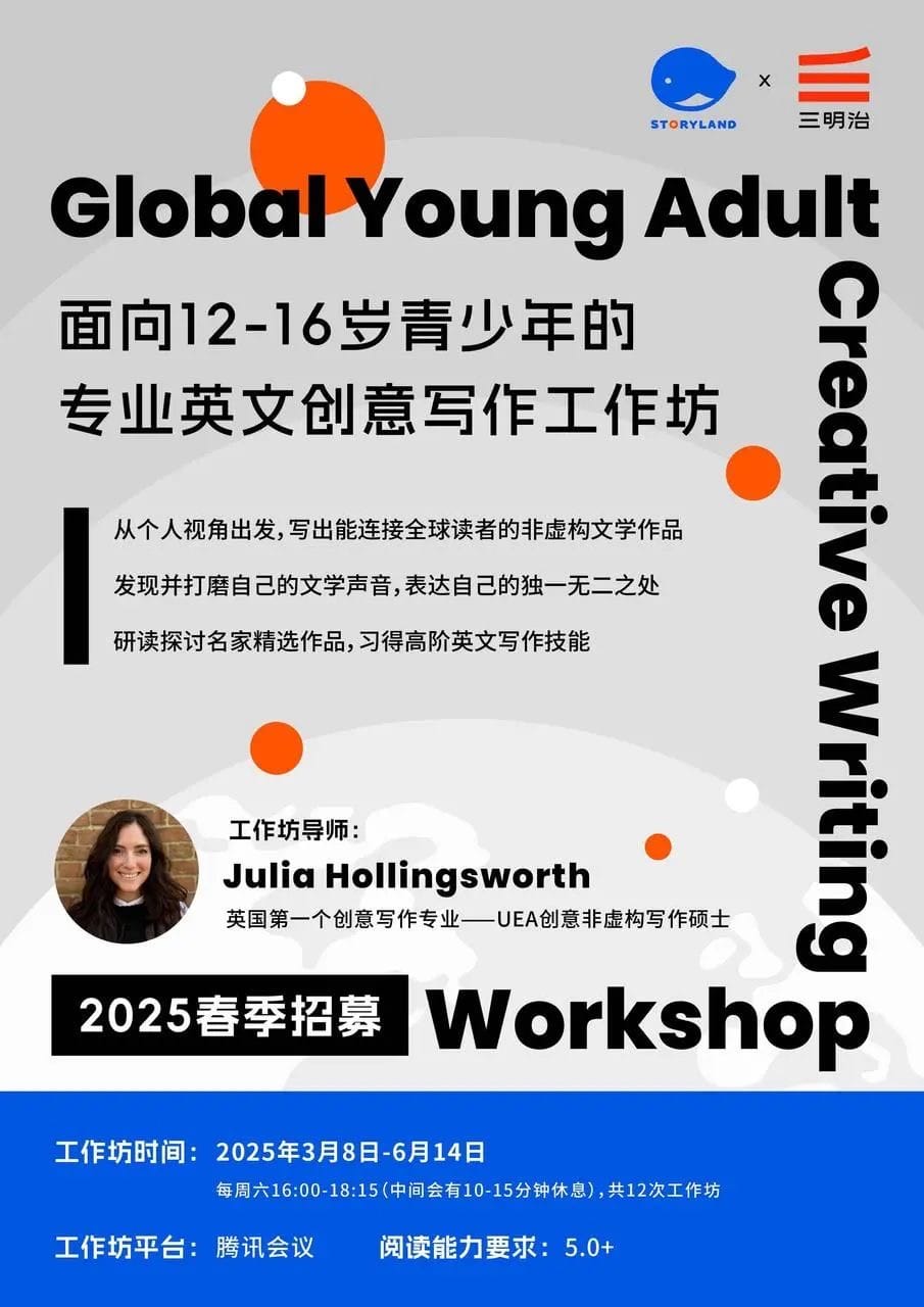 我还开发了12-16岁青少年的英文创意写作项目,和我UEA的同学Julia Hollingsworth一起指导来自6个国家的8个孩子,在12周里写作两部作品。这个项目,我们在暑期和秋季都会继续做下去。(点击海报可了解详情)