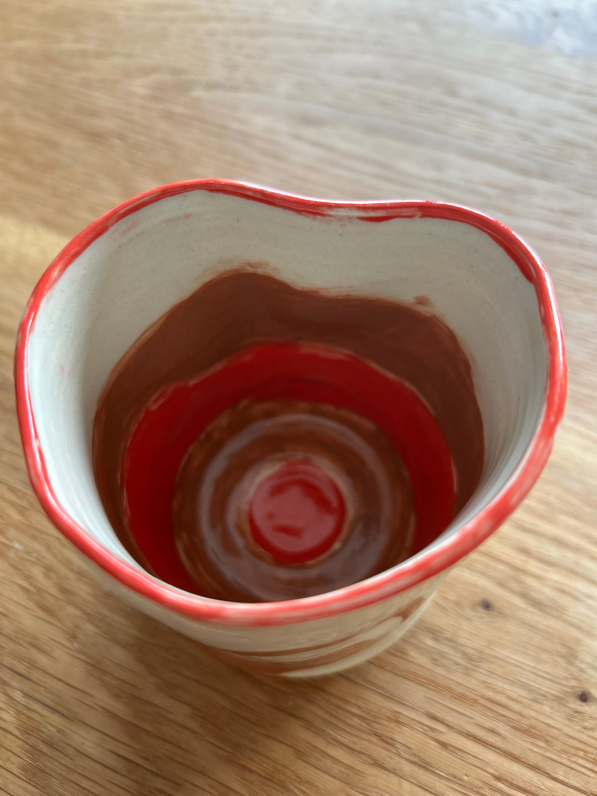 小创送我一个在景德镇做的杯子做生日礼物。这个杯子做得很特别,不是传统的圆形,而是有双手可以捧住的弧度,杯口一圈红色不整齐,但能看到涂画的笔触。它是任何市集买不到的杯子,在杯身可以看见当时的模样,被烈火烤过之后长时间停留的现场,这不就是无形记忆的有形化么?写作也是这样。记忆停在那刻,凝望着此刻的我。