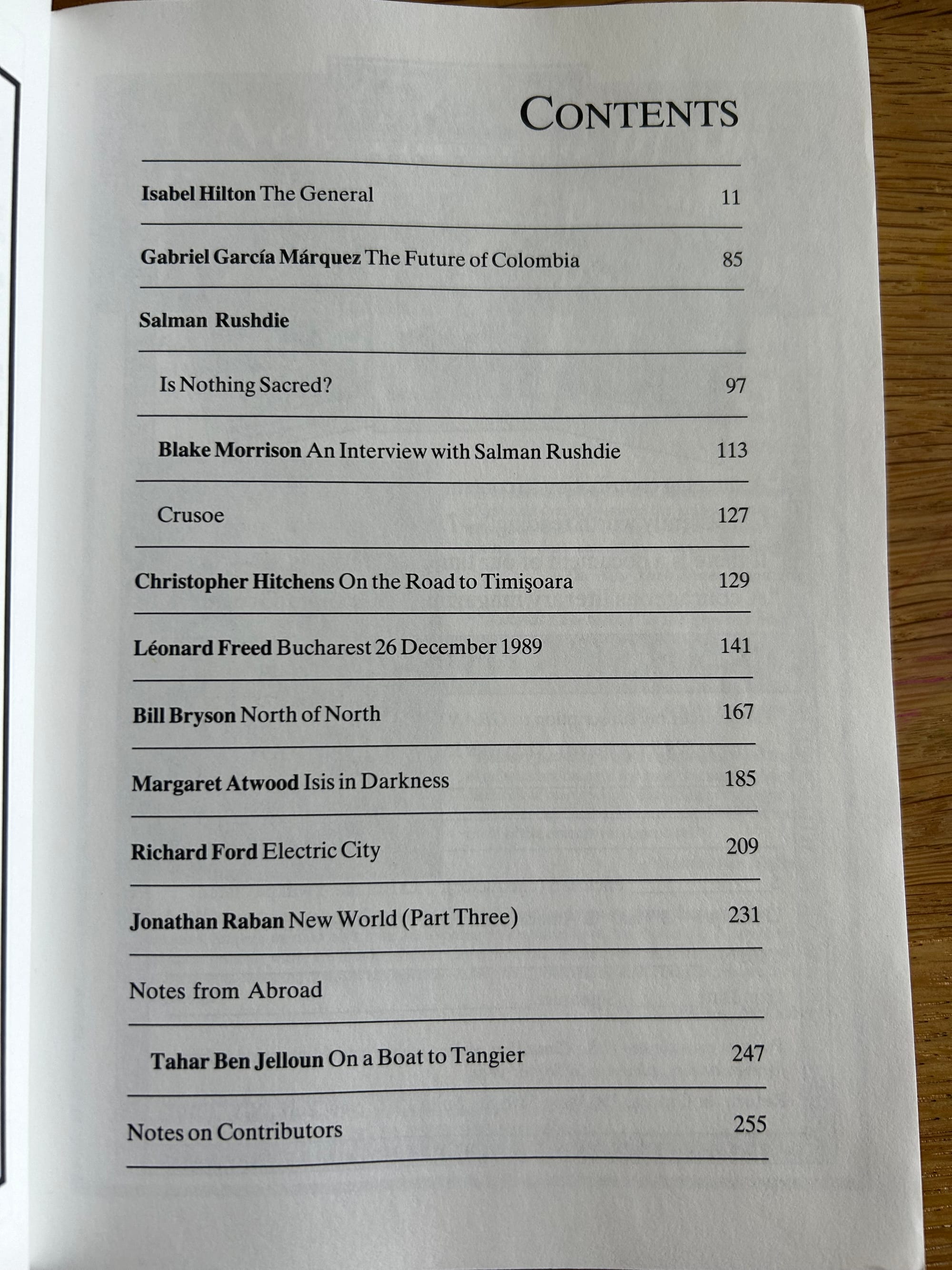 这本书里面收录了很多今天看来都赫赫有名的作家,加西亚·马尔克斯、Salman Rushdie、玛格丽特·阿特伍德、Bill Bryson等等。但令我意外的是,这期Granta大部分的文章都是文学性非虚构作品,整本书我翻了一下,只有阿特伍德的写作是小说。封面故事The General是一个关于巴拉圭前独裁者General Alfredo Stroessner 的长篇。马尔克斯的作品是The Future of Colombia, 关于哥伦比亚国家命运的探讨。Bill Bryson是旅行写作。里面还有一位罗马尼亚摄影师拍摄的东欧剧变影集。以至于我怀疑我看的是一本假Granta, 因为印象中,Granta所倡导的New Writing基本都是小说作品。